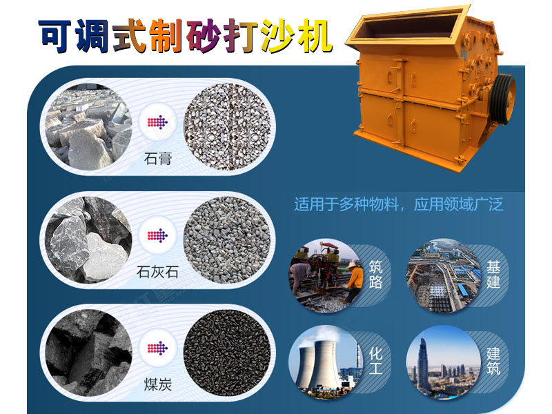 1612可調(diào)式打沙機(jī)廣泛應(yīng)用于鐵路建設(shè)、公路建設(shè)、市政建設(shè)、水泥廠、建材業(yè)、陶瓷業(yè)、化工等領(lǐng)域,破碎石灰石、石膏、白堊、煤、明礬等中硬及較軟物料